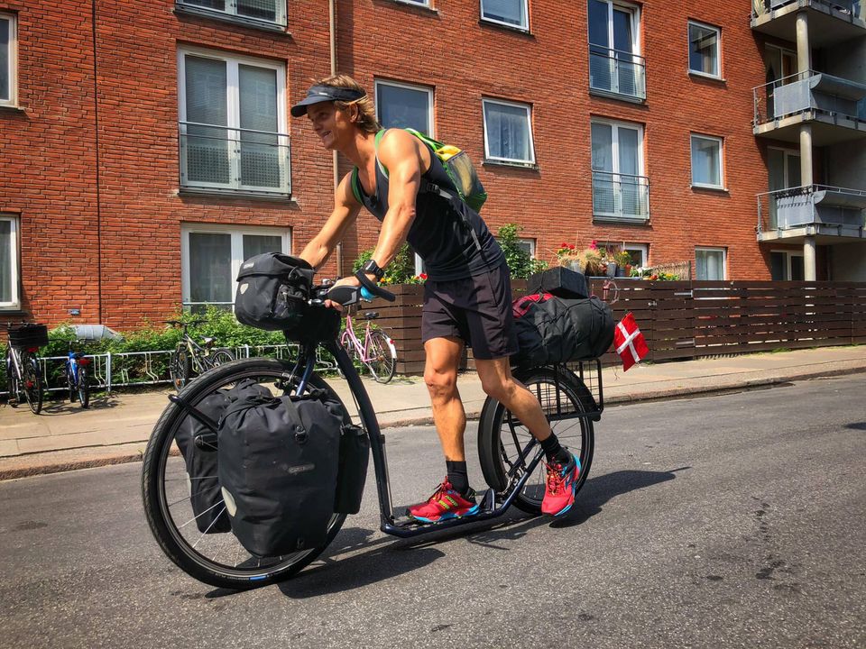 »Lige nu står jeg langs landevejen mellem Odense og Bogense med løbehjulet mellem benene, mens bilerne suser forbi,« siger Nicolai Bangsgaard i telefonen, da Jyllands-Posten ringer ham op onsdag eftermiddag.