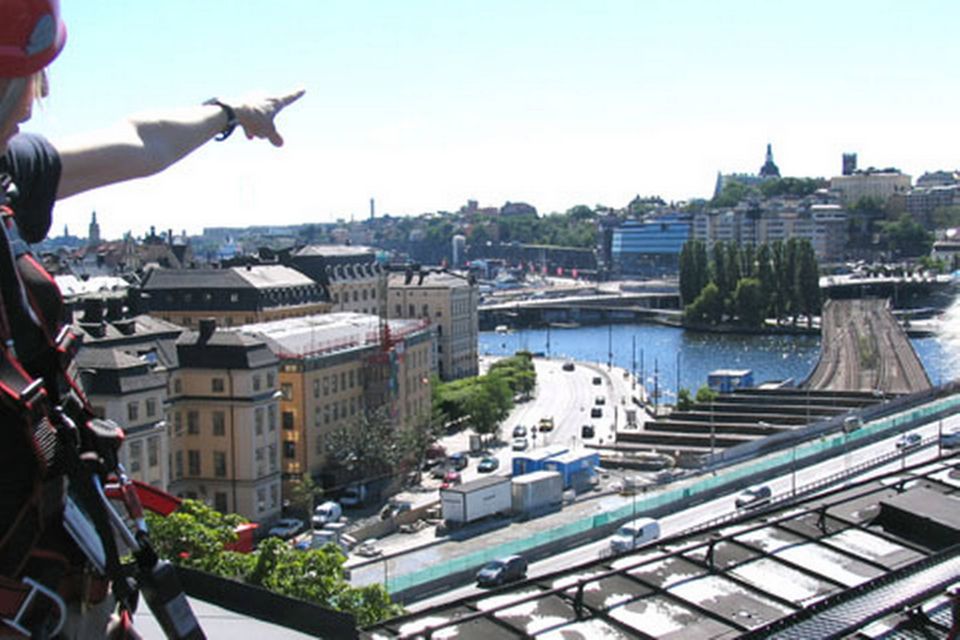Guiden tager imod ved statuen af Stockholms grundlægger, Birger Jarl. Hun bringer gruppen med op under taget i en af de gamle bygninger, hvor vi under hanebjælkerne bliver iført hjelm og sikkerhedssele, som gøres fast til en stålwire langs hele ruten.