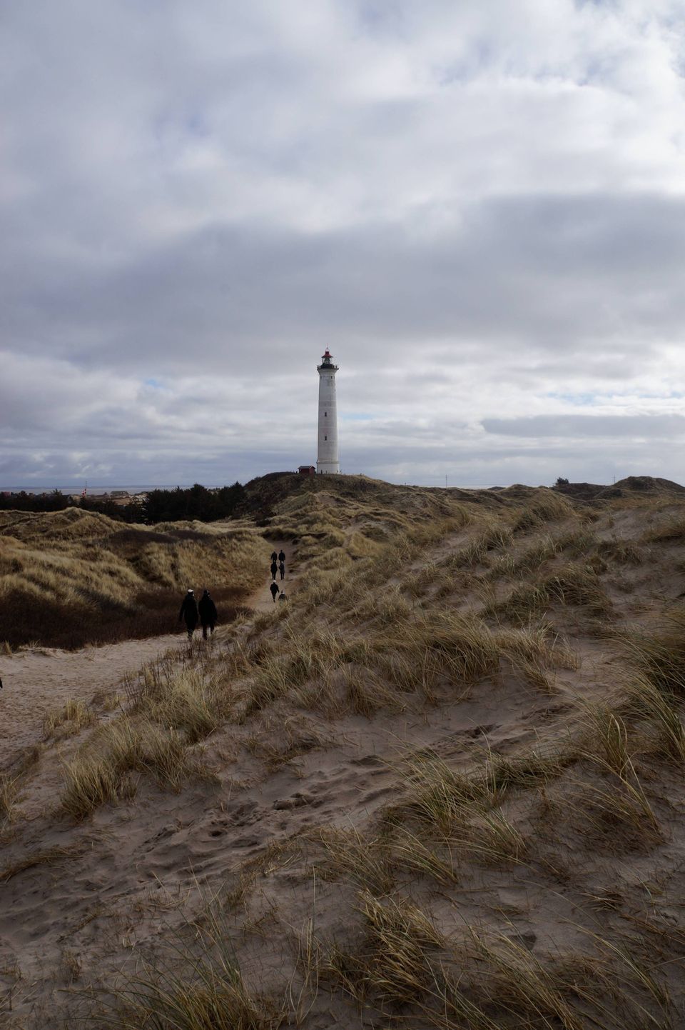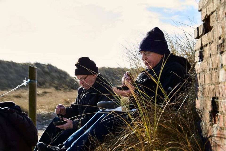 Trods flere af deltagerne har nået pensionsalderen, er der fart på fødderne. Den første dag bliver der gået mange, tunge skridt i sandet ved de vestjyske klitter. Den næste er kilometerne færre, men højdekurverne værre. I alt 228 trin er der nemlig til toppen af Lyngvig Fyr ved Holmsland Klit i Hvide Sande. Hvis man vel at mærke tæller de 69 regnvåde trætrin fra parkeringspladsen og op til fyrets fod med. Herfra må man lægge nakken tilbage for at få hele det 110 år gamle bygningsværk inden for synsfeltet. 53 meter strækker det sig over vandoverfladen. Og det får man at føle i fyrets rungende trappeopgang. Jo højere man bevæger sig op, jo højere bliver også lyden af luft, der trækker sig ind og ud af lungerne. Hæle, der med mere og mere tyngde træder ned på de grå betontrin.