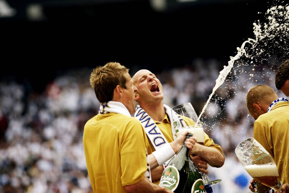 Peter Møller og Peter Christiansen jubler over FC Københavns DM-guld i 2003. En titel, der kom i hus efter 4-1 over AGF, sportschefens nuværende klub. Foto: Thomas Borberg