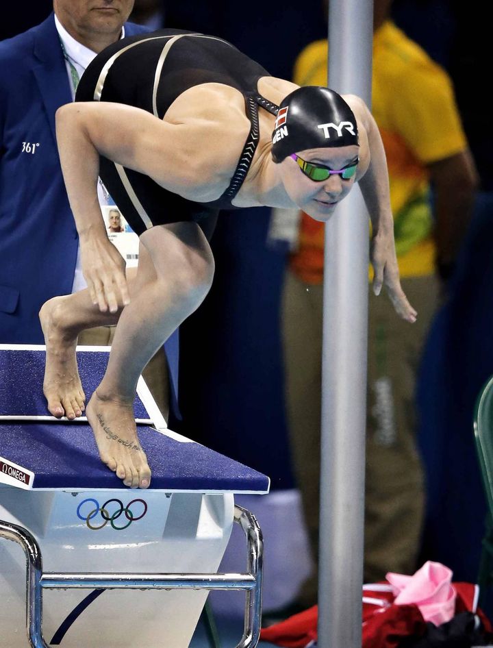 Da svømmerne står klar, er Pernille Blume på bane 4 den sidste, der retter badehætten og bøjer sig ned.
