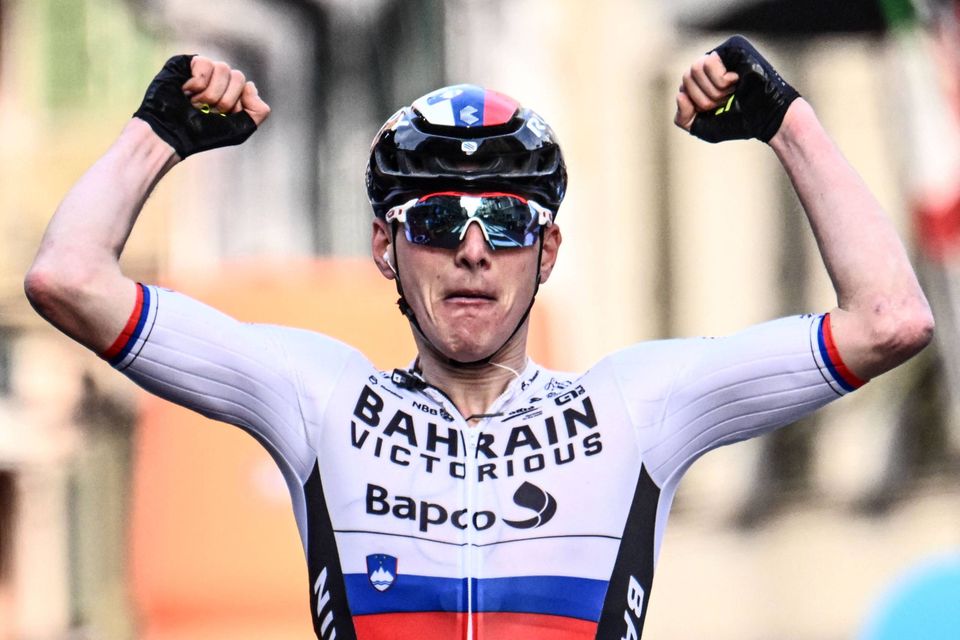 Han holdt sig dog på cyklen, og det betød, at han havde et forspring, da rytterne ramte bunden. Selv om blandt andre Søren Kragh Andersen og Mads Pedersen gjorde deres for at hente sloveneren, så lykkedes det ikke.