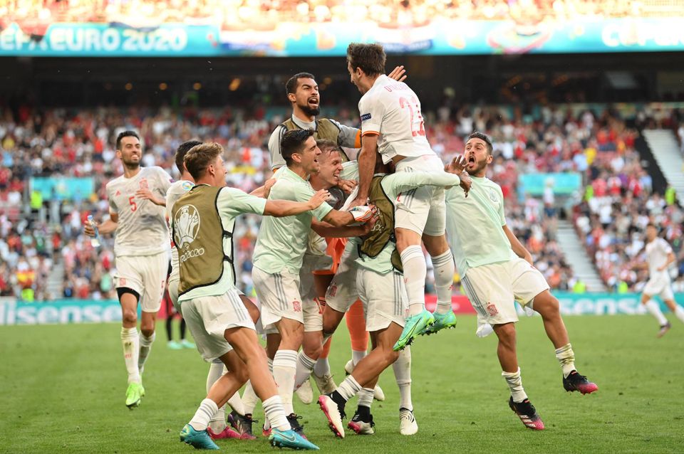 Nede det spanske mål kunne man se Unai Simon falde på knæ i jubel.