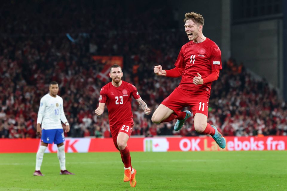 Men altså, det vendte efter en halv time, og et kvarter ind i anden halvleg blev de to skiftet ud med Rasmus Højlund og Jesper Lindstrøm til at supplere Andreas Skov Olsen helt fremme. Ikke tre navne af samme kaliber som den franske fronttrio, men mindre kan gøre det.